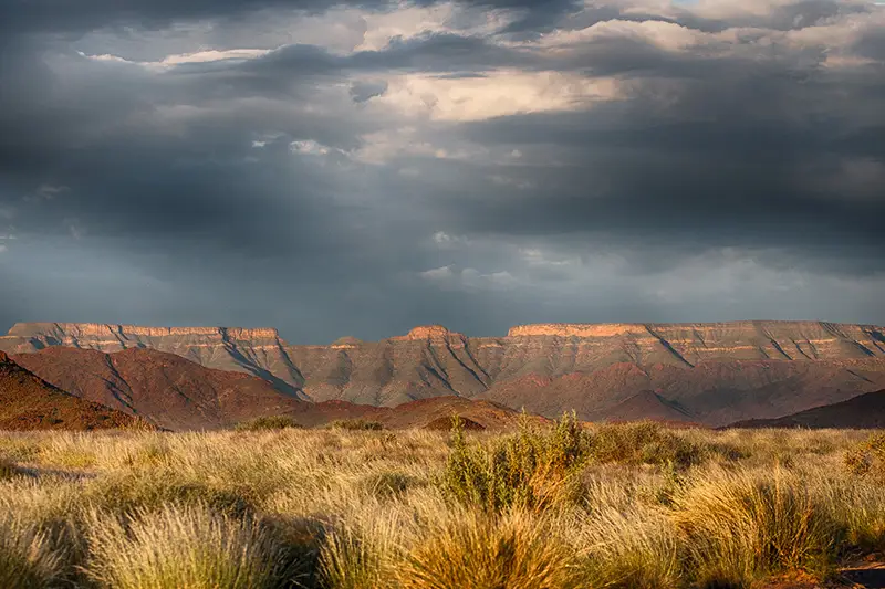 À l’est du Namib se trouve le Grand Escarpement, une chaîne de chaînes de montagnes qui s’élèvent à 2 000 mètres, et qui se poursuivent en forme de U le long des terres intérieures de la partie sud du continent africain. En Afrique du Sud, une partie bien connue de cet escarpement est les « Drakensbergen ». En Namibie, des parties de l’Escarpement sont les Khomas Highland, le Gamsberg, les montagnes du Naukluft et les montagnes du Tiras. À l’est de l’escarpement se trouvent les Hautes Terres Centrales, formant la plus grande partie de la Namibie et couvrant le centre du pays. La ville de Windhoek est située ici à environ 1 700 mètres au-dessus du niveau de la mer. À l’est des hautes terres se trouve le désert du Kalahari qui, bien que techniquement un désert, reçoit l’humidité d’une richesse souterraine d’eau et est donc recouvert d’acacias. Comme dans la plupart des parties de la Namibie, ces sources d’eau sont des rivières éphémères qui ne couleront que lorsque la source de la rivière sera alimentée par l’eau de pluie. Les animaux et les gens utilisent ces réserves d’eau en creusant dans les lits de rivières secs pour trouver de l’eau.